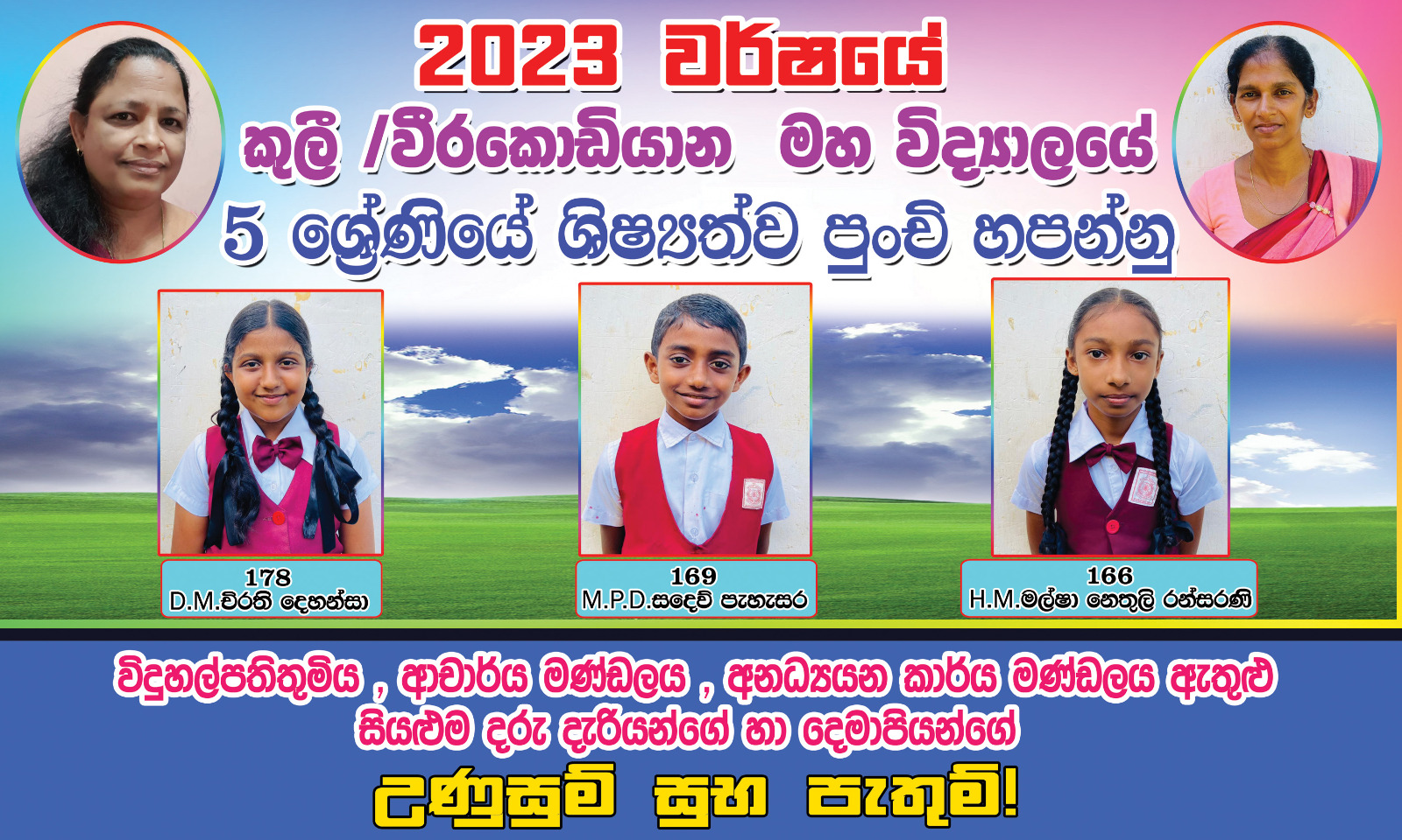 කුලී/වීරකොඩියාන මහා විද්යාලයේ ශිෂ්ය නායක සංචිතය පසුගියදා විසිරුවා හැරුණි. නව වසර සඳහා නැවත ශිෂ්ය නායක සංචිතය බලගැන්වීම සඳහා අයදුම්පත් කැඳවේ.2024.03.18 දින සිට කාර්යාලයෙන් ඊට අදාළ අයදුම්පත් ලබාගත හැකි බව විදුහල්පතිතුමා සියලු සිසුසිසුවියන්ට දන්වා සිටී.